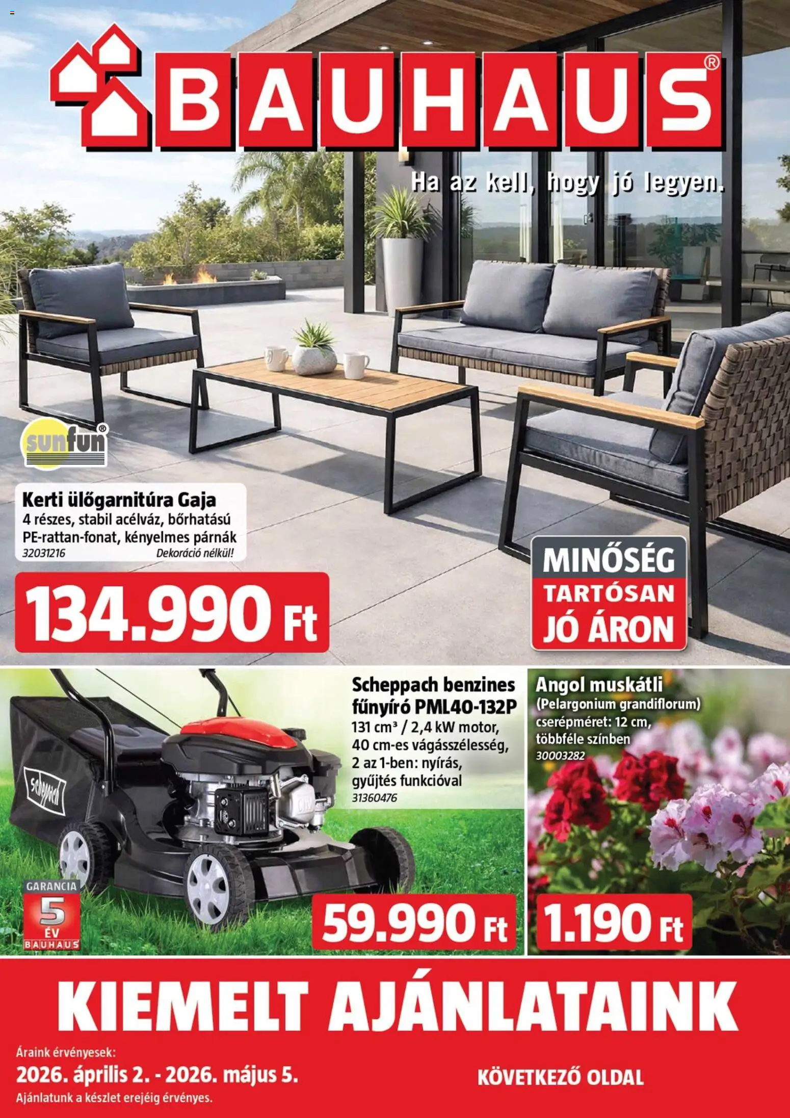 Érkezett a(z) Bauhaus legfrissebb akciós újsága, mely az egyik legkedveltebb áruházlánc Magyarországon. Az új szórólap, ami 32 oldalból áll, számos vonzó ajánlatot kínál, amelyek csak rövid ideig, 2026.04.02. - 2026.05.05. között érvényesek.