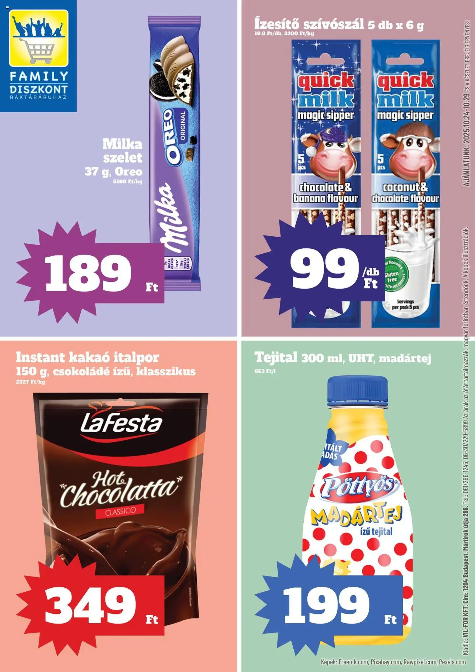 Az új Family Diszkont akciós újság lapozható online formában bárhonnan könnyedén megtekinthető, így néhány kattintással felfedezheti a legjobb aktuális ajánlatokat. A katalógusban részletesen látható, hogy mely termékek meddig érvényesek (2025.10.24. - 2025.10.29.), ezért érdemes időben kihasználni a kedvezményeket. A heti szórólap nemcsak az alapvető élelmiszerekre, hanem a háztartási cikkekre és szezonális újdonságokra is jelentős árengedményeket kínál, így minden vásárlás során spórolhat. Ha szeret előre tervezni, lapozza át a Family Diszkont újságot, és állítsa össze a saját bevásárlólistáját a legjobb ajánlatok alapján!
