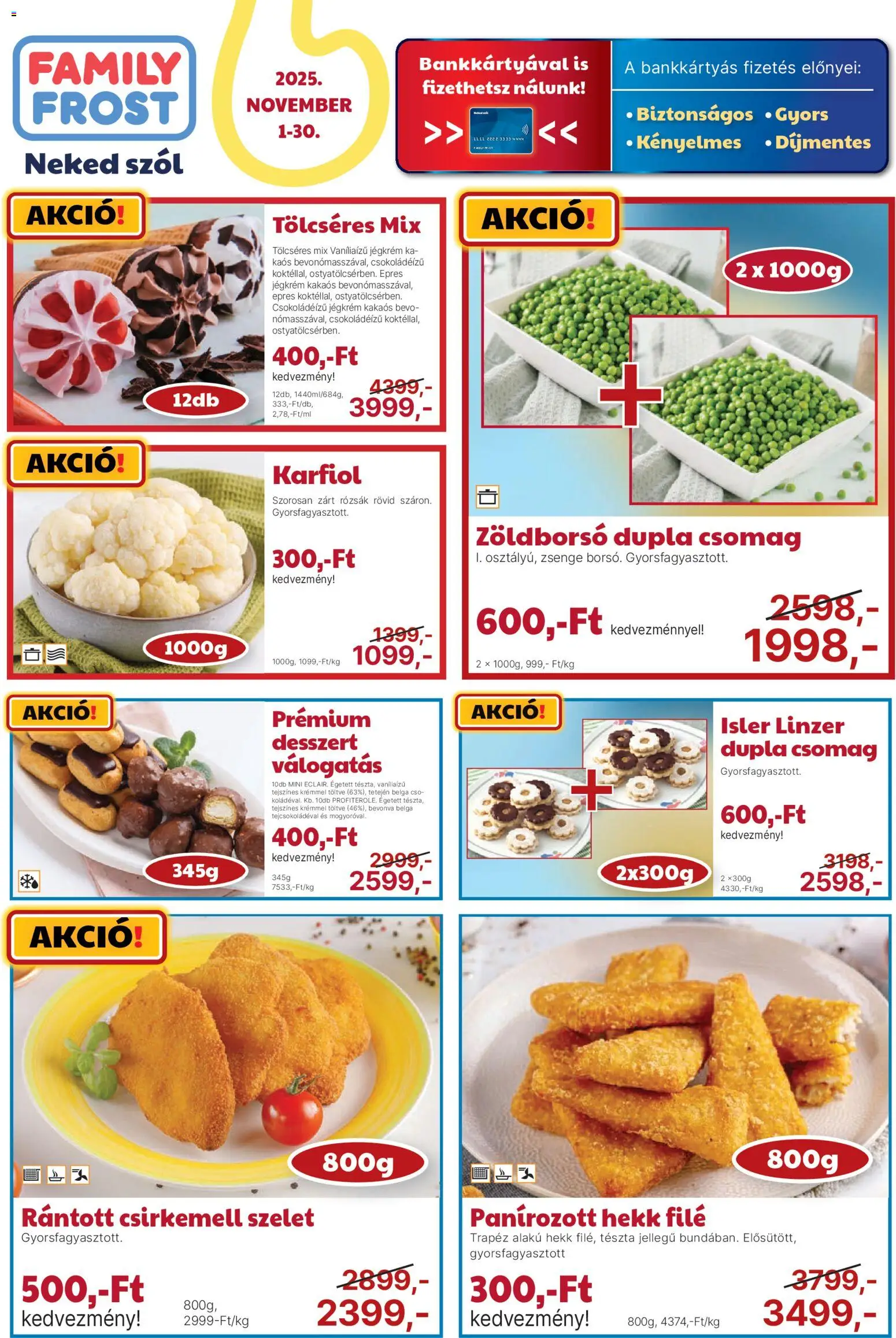 Az új Family Frost akciós újság lapozható online formában bárhonnan könnyedén megtekinthető, így néhány kattintással felfedezheti a legjobb aktuális ajánlatokat. A katalógusban részletesen látható, hogy mely termékek meddig érvényesek (2025.11.01. - 2025.11.30.), ezért érdemes időben kihasználni a kedvezményeket. A heti szórólap nemcsak az alapvető élelmiszerekre, hanem a háztartási cikkekre és szezonális újdonságokra is jelentős árengedményeket kínál, így minden vásárlás során spórolhat. Ha szeret előre tervezni, lapozza át a Family Frost újságot, és állítsa össze a saját bevásárlólistáját a legjobb ajánlatok alapján!