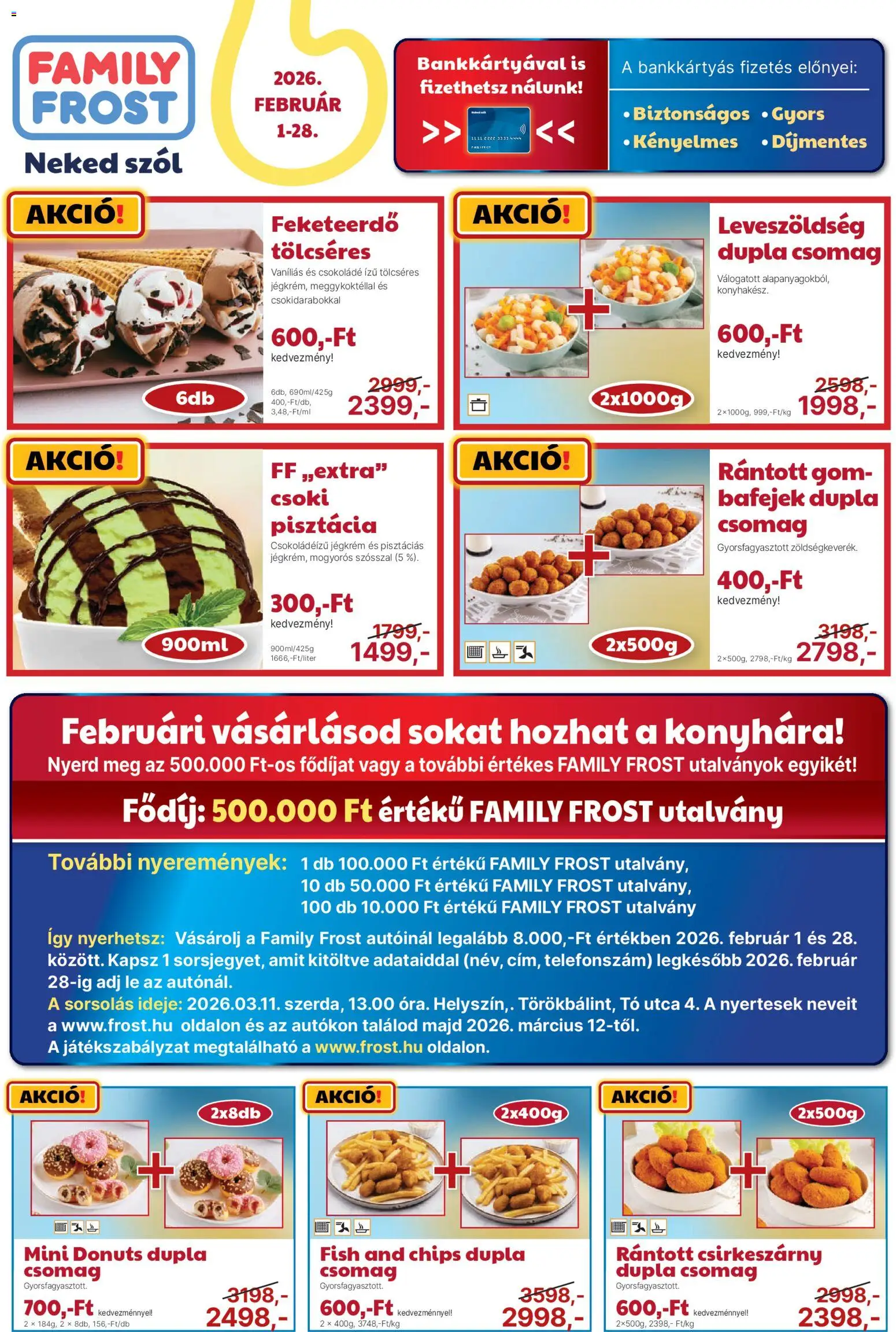 Az új Family Frost akciós újság lapozható online formában bárhonnan könnyedén megtekinthető, így néhány kattintással felfedezheti a legjobb aktuális ajánlatokat. A katalógusban részletesen látható, hogy mely termékek meddig érvényesek (2026.02.01. - 2026.02.28.), ezért érdemes időben kihasználni a kedvezményeket. A heti szórólap nemcsak az alapvető élelmiszerekre, hanem a háztartási cikkekre és szezonális újdonságokra is jelentős árengedményeket kínál, így minden vásárlás során spórolhat. Ha szeret előre tervezni, lapozza át a Family Frost újságot, és állítsa össze a saját bevásárlólistáját a legjobb ajánlatok alapján!