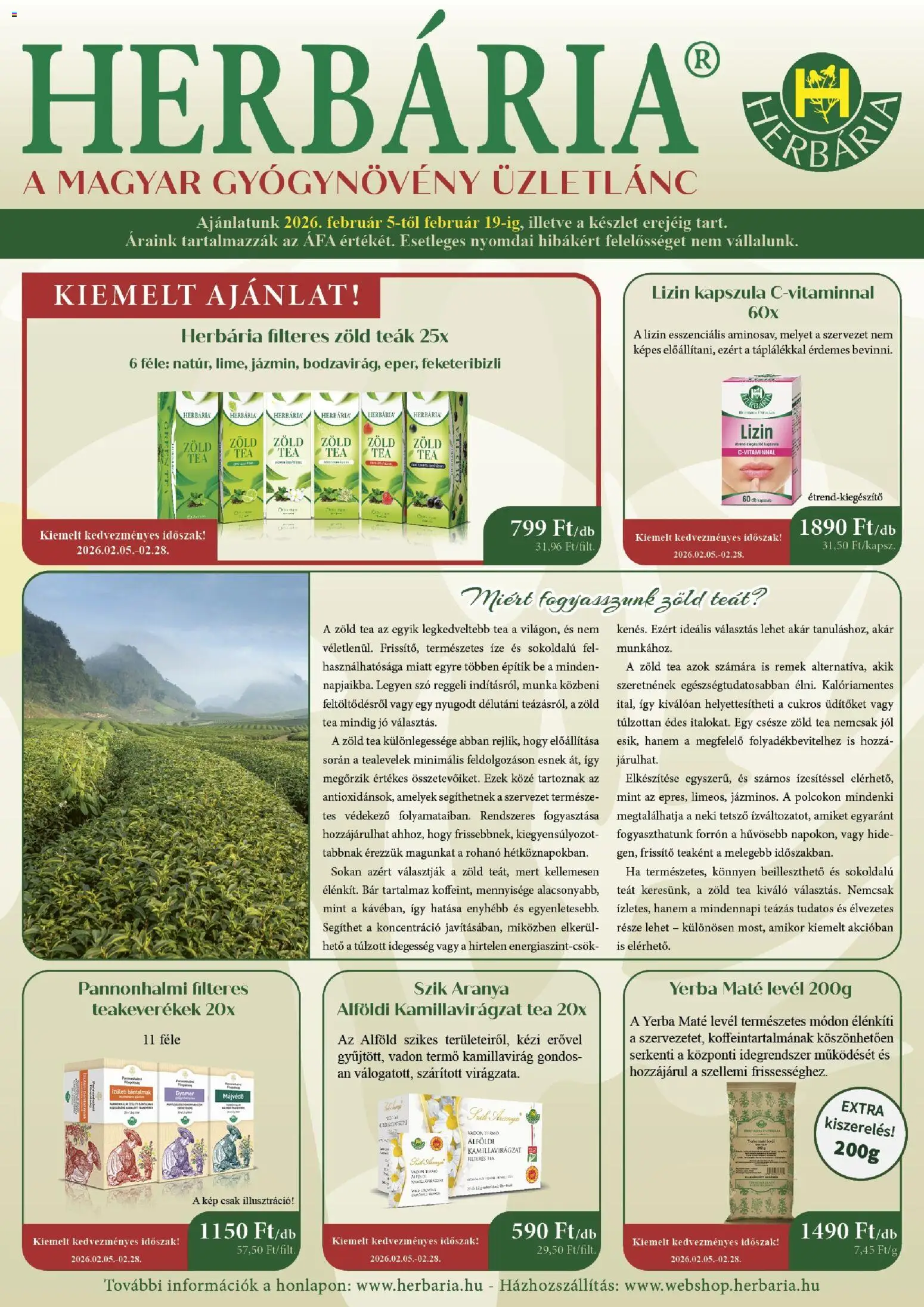 Érkezett a(z) Herbária legfrissebb akciós újsága, mely az egyik legkedveltebb áruházlánc Magyarországon. Az új szórólap, ami 2 oldalból áll, számos vonzó ajánlatot kínál, amelyek csak rövid ideig, 2026.02.05. - 2026.02.19. között érvényesek.