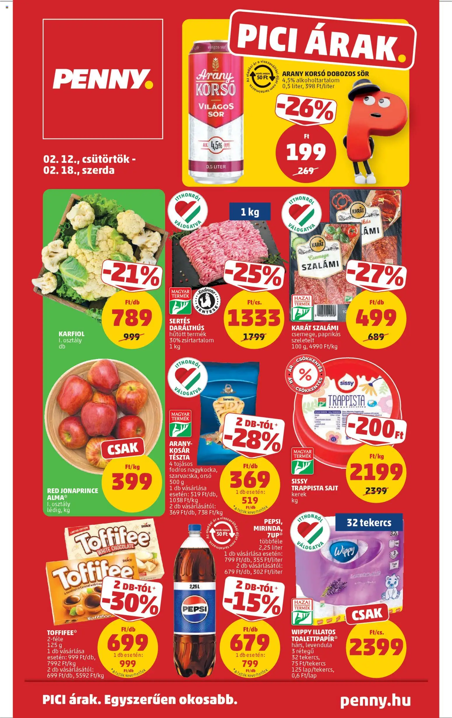Az új PENNY akciós újság lapozható online formában bárhonnan könnyedén megtekinthető, így néhány kattintással felfedezheti a legjobb aktuális ajánlatokat. A katalógusban részletesen látható, hogy mely termékek meddig érvényesek (2026.02.12. - 2026.02.18.), ezért érdemes időben kihasználni a kedvezményeket. A heti szórólap nemcsak az alapvető élelmiszerekre, hanem a háztartási cikkekre és szezonális újdonságokra is jelentős árengedményeket kínál, így minden vásárlás során spórolhat. Ha szeret előre tervezni, lapozza át a PENNY újságot, és állítsa össze a saját bevásárlólistáját a legjobb ajánlatok alapján!
