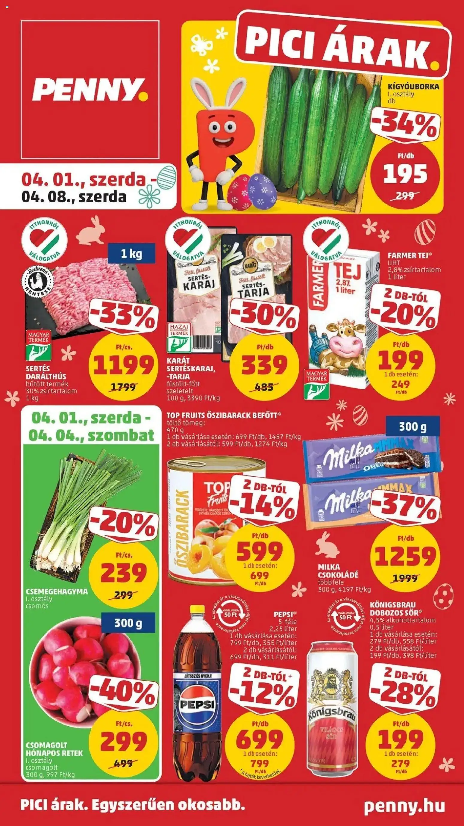 Az új PENNY akciós újság lapozható online formában bárhonnan könnyedén megtekinthető, így néhány kattintással felfedezheti a legjobb aktuális ajánlatokat. A katalógusban részletesen látható, hogy mely termékek meddig érvényesek (2026.04.01. - 2026.04.08.), ezért érdemes időben kihasználni a kedvezményeket. A heti szórólap nemcsak az alapvető élelmiszerekre, hanem a háztartási cikkekre és szezonális újdonságokra is jelentős árengedményeket kínál, így minden vásárlás során spórolhat. Ha szeret előre tervezni, lapozza át a PENNY újságot, és állítsa össze a saját bevásárlólistáját a legjobb ajánlatok alapján!