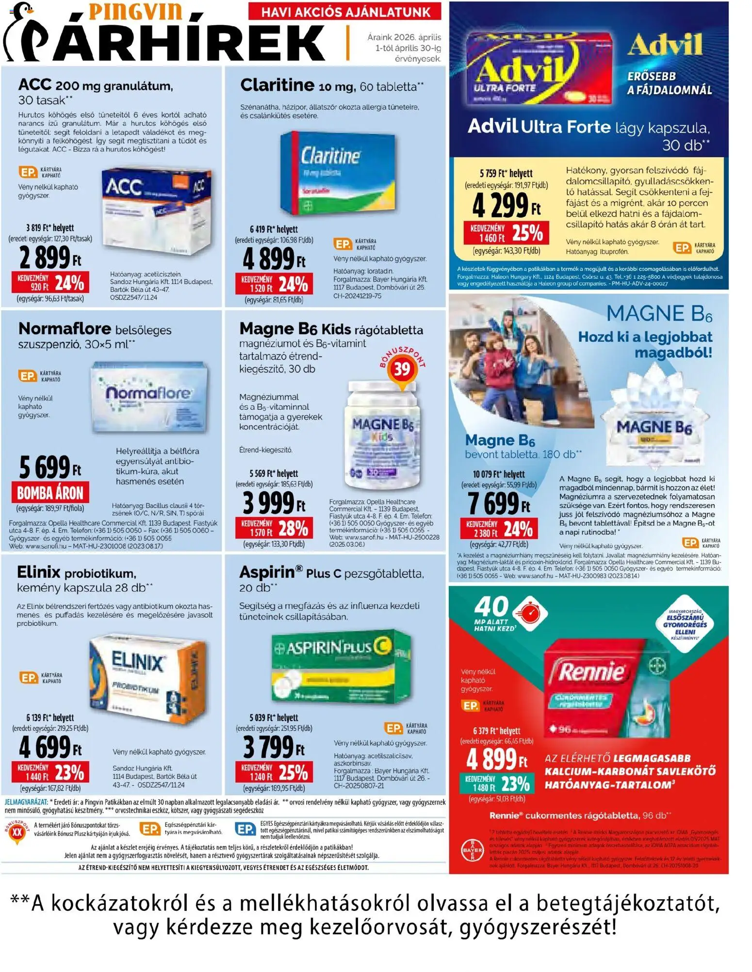 Az új Pingvin Patika akciós újság lapozható online formában bárhonnan könnyedén megtekinthető, így néhány kattintással felfedezheti a legjobb aktuális ajánlatokat. A katalógusban részletesen látható, hogy mely termékek meddig érvényesek (2026.04.01. - 2026.04.30.), ezért érdemes időben kihasználni a kedvezményeket. A heti szórólap nemcsak az alapvető élelmiszerekre, hanem a háztartási cikkekre és szezonális újdonságokra is jelentős árengedményeket kínál, így minden vásárlás során spórolhat. Ha szeret előre tervezni, lapozza át a Pingvin Patika újságot, és állítsa össze a saját bevásárlólistáját a legjobb ajánlatok alapján!