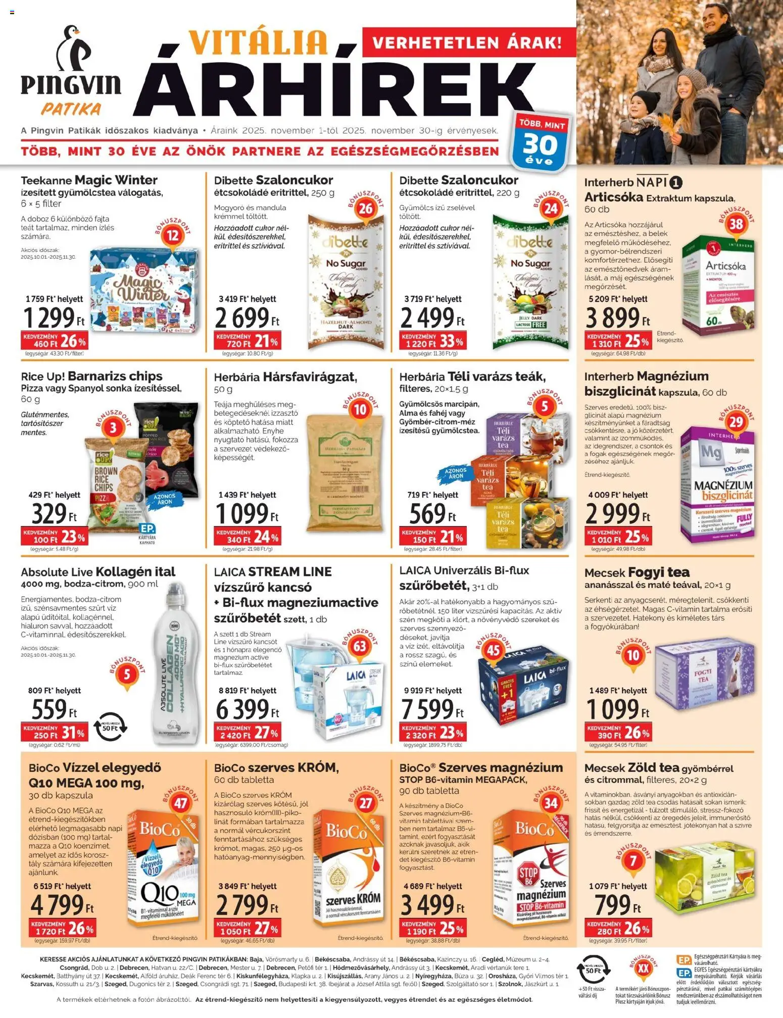 Az új Pingvin Patika akciós újság lapozható online formában bárhonnan könnyedén megtekinthető, így néhány kattintással felfedezheti a legjobb aktuális ajánlatokat. A katalógusban részletesen látható, hogy mely termékek meddig érvényesek (2025.11.01. - 2025.11.30.), ezért érdemes időben kihasználni a kedvezményeket. A heti szórólap nemcsak az alapvető élelmiszerekre, hanem a háztartási cikkekre és szezonális újdonságokra is jelentős árengedményeket kínál, így minden vásárlás során spórolhat. Ha szeret előre tervezni, lapozza át a Pingvin Patika újságot, és állítsa össze a saját bevásárlólistáját a legjobb ajánlatok alapján!