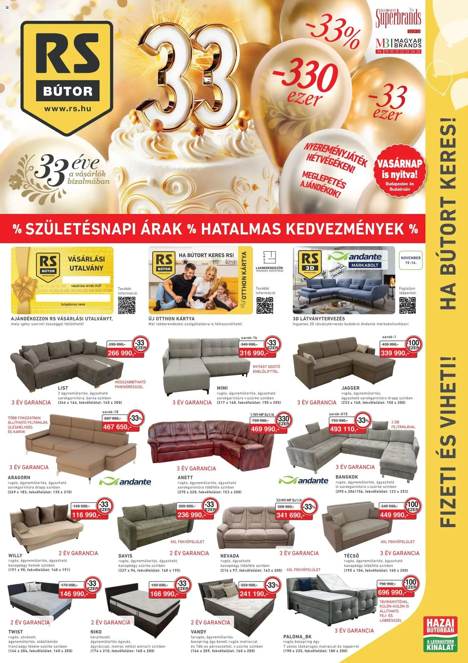 Az új RS Bútor akciós újság lapozható online formában bárhonnan könnyedén megtekinthető, így néhány kattintással felfedezheti a legjobb aktuális ajánlatokat. A katalógusban részletesen látható, hogy mely termékek meddig érvényesek (2025.10.30. - 2025.11.16.), ezért érdemes időben kihasználni a kedvezményeket. A heti szórólap nemcsak az alapvető élelmiszerekre, hanem a háztartási cikkekre és szezonális újdonságokra is jelentős árengedményeket kínál, így minden vásárlás során spórolhat. Ha szeret előre tervezni, lapozza át a RS Bútor újságot, és állítsa össze a saját bevásárlólistáját a legjobb ajánlatok alapján!