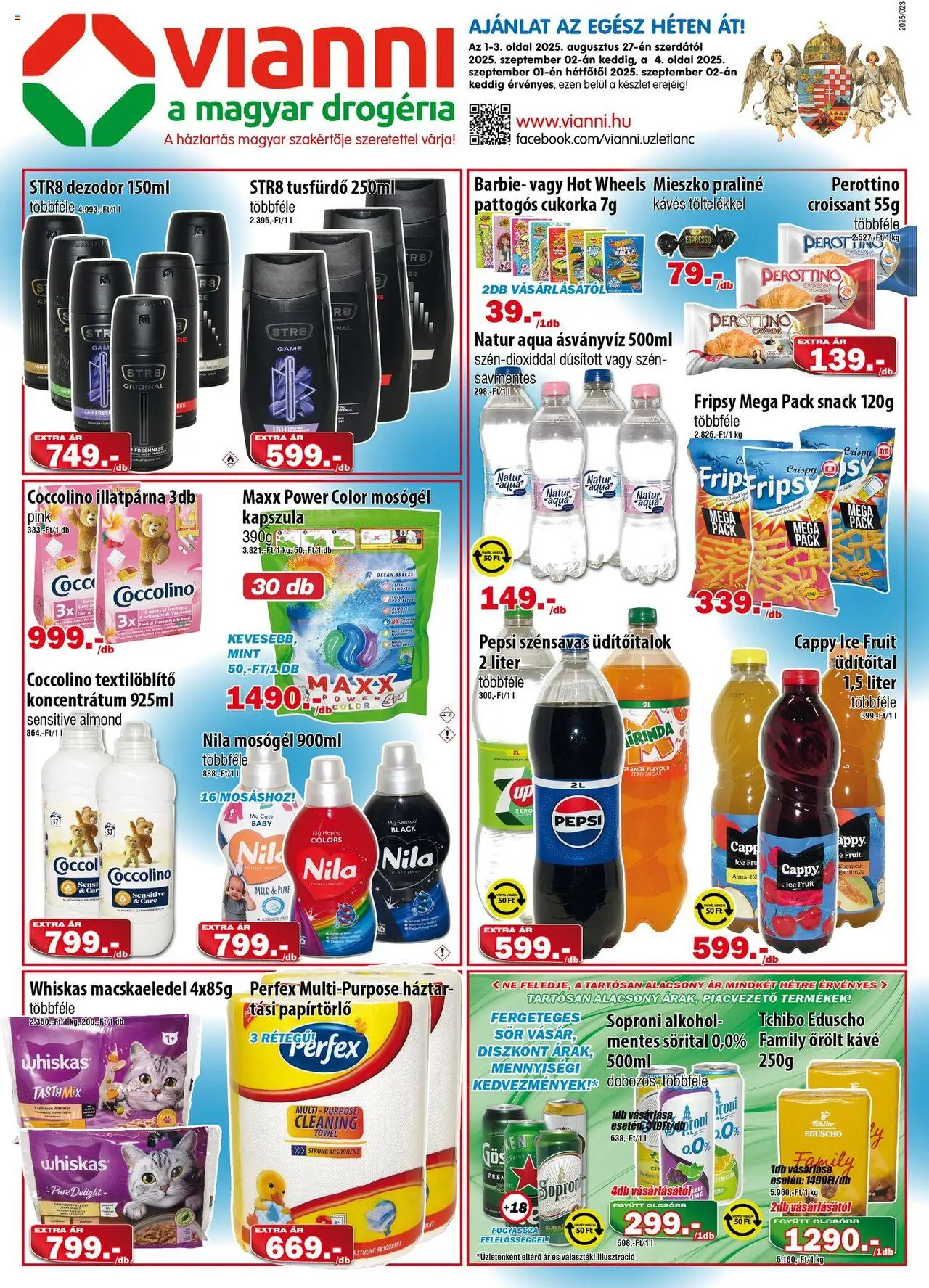 Érkezett a(z) Vianni legfrissebb akciós újsága, mely az egyik legkedveltebb áruházlánc Magyarországon. Az új szórólap, ami 2 oldalból áll, számos vonzó ajánlatot kínál, amelyek csak rövid ideig, 2025.08.27. - 2025.09.02. között érvényesek.